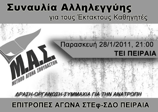 Χωρίς κατηγορίαΣυναυλία Αλληλεγγύης για τους Έκτακτους Καθηγητές στις 28/1/2011 spoudastes27/01/201127/01/201101 mins Πλοήγηση άρθρων Previous: ΔΕΛΤΙΟ ΤΥΠΟΥ Για γεγονότα με τους μετανάστες στη ΝΟΠΕNext: Εργαζόμενοι Φοιτητες Οργανωνόμαστε για την Ανατροπή