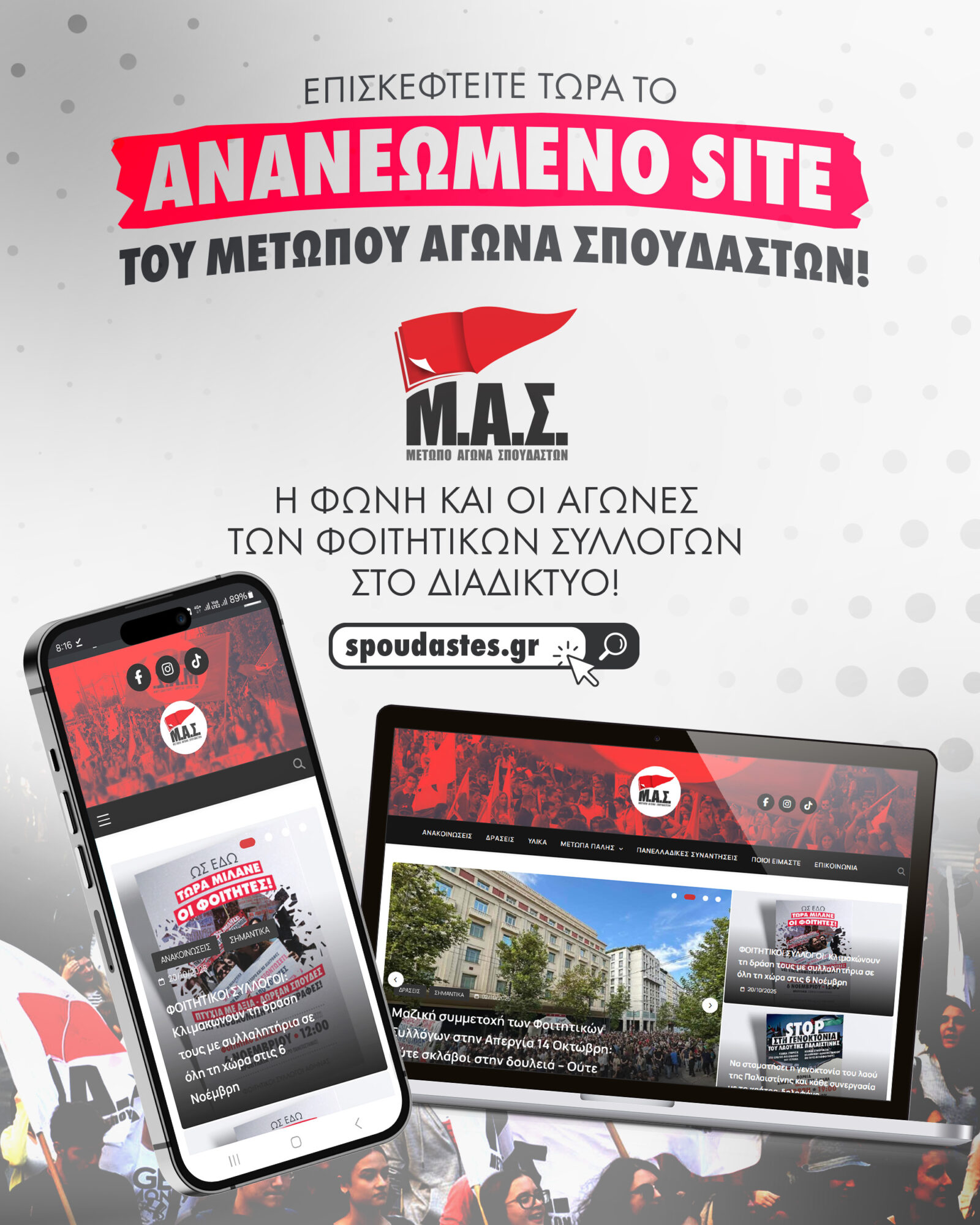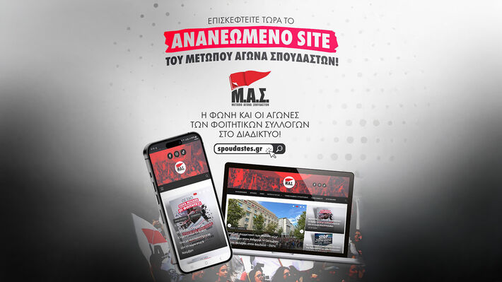 Στον αέρα βρίσκεται πλέον η ανανεωμένη ιστοσελίδα του Μετώπου Αγώνα Σπουδαστών στη ίδια διεύθυνση με πριν στο www.spoudastes.gr