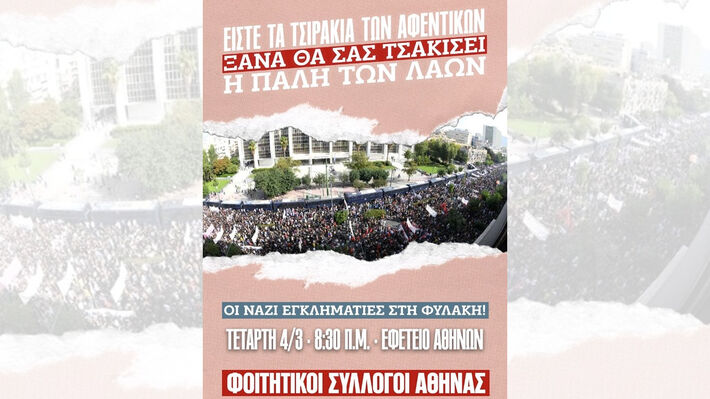 Όλοι και όλες στην κινητοποίηση των εργατικών σωματείων και των φοιτητικών συλλόγων έξω από το Εφετείο Αθηνών, την Τετάρτη 4 Μαρτίου στις 8.30 π.μ».
