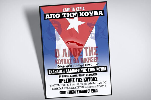 Εκδήλωση αλληλεγγύης στην Κούβα διοργανώνουν την Πέμπτη 5 Μάρτη, στις 2.30 μ.μ. στο αμφιθέατρο γενικών συνελεύσεων της Σχολής ΗΜΜΥ οι Φοιτητικοί Σύλλογοι του ΕΜΠ. Θα μιλήσει ο Aramis Fuente Hernandez, πρέσβης της Κούβας. Στην ανακοίνωσή τους, οι Φοιτητικοί Σύλλογοι σημειώνουν: «Ο Φοιτητικός μας Σύλλογος καταδικάζει τις εντεινόμενες απειλές από τις ΗΠΑ και τους συμμάχους τους ενάντια στην Κούβα και…