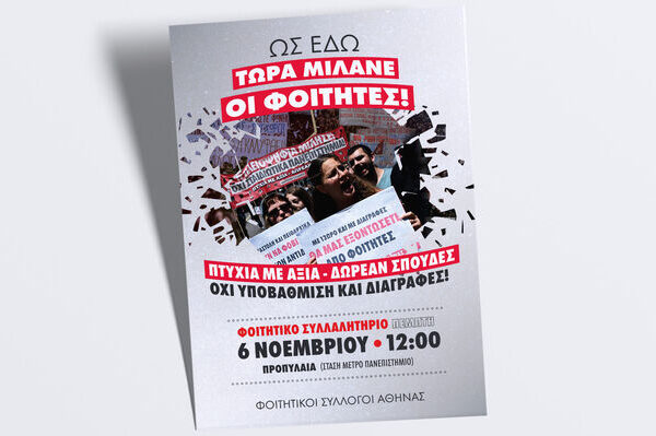 «Όλοι στη μεγάλη αντιιμπεριαλιστική πορεία προς την αμερικανική Πρεσβεία, 17 Νοέμβρη 16:30 Προπύλαια!», τονίζεται σε κάλεσμα των Φοιτητικών Συλλόγων Αθήνας, στο οποίο επισημαίνεται, «Το Πολυτεχνείο ζει! Οργάνωση και αγώνας για την ανατροπή – στο σύστημα του κέρδους καμιά υποταγή!» Αναλυτικά αναφέρουν: «Την Παρασκευή 7 Νοέμβρη πραγματοποιήθηκε σύσκεψη συντονισμού των Φοιτητικών Συλλόγων της Αθήνας στον απόηχο των μεγάλων φοιτητικών…
