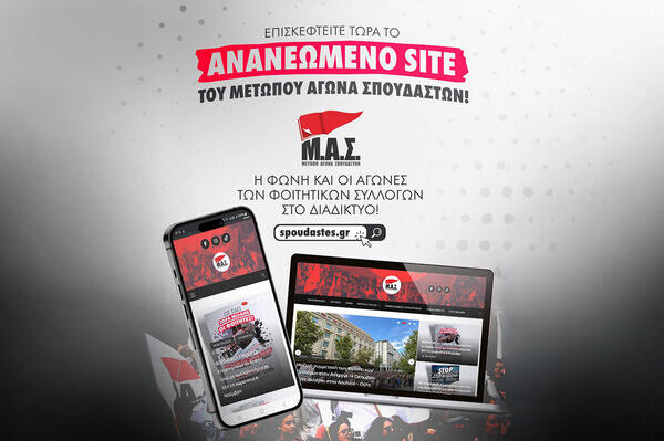 Στον αέρα βρίσκεται πλέον η ανανεωμένη ιστοσελίδα του Μετώπου Αγώνα Σπουδαστών στη ίδια διεύθυνση με πριν στο www.spoudastes.gr Η ανανέωση του site ήταν απόφαση της τελευταίας πανελλαδικής συνάντησης του ΜΑΣ όπου έθεσε το στόχο να προβληθεί με καλύτερους όρους η δράση των Φοιτητικών Συλλόγων σε όλη την Ελλάδα “με ανταποκρίσεις, ενημερώσεις και άλλα υλικά με…