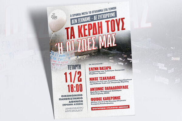 Στις 28 Φλεβάρη συμπληρώνονται 3 χρόνια από το προδιαγεγραμμένο έγκλημα στα Τέμπη που στοίχισε τη ζωή σε 57 συνανθρώπους μας και συγκλόνισε όλο το λαό μας, ενώ λίγες μέρες μετά, στις 23 Μάρτη είναι προγραμματισμένη η έναρξη της δίκης Οι Φοιτητικοί Σύλλογοι Αθήνας διοργανώνουν μεγάλη εκδήλωση την Τετάρτη 11 Φλεβάρη, στο Οικονομικό Πανεπιστήμιο Αθηνών, στο…