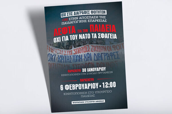 «Να καταργηθεί ο απαράδεκτος νόμος των διαγραφών – Όχι στην απόσπαση της παιδαγωγικής επάρκειας από τα πτυχία – Λεφτά για την Παιδεία και όχι για του ΝΑΤΟ τα σφαγεία» τονίζουν οι Φοιτητικοί Σύλλογοι σε όλη την Ελλάδα, καλώντας τους φοιτητές και τις φοιτήτριες σε πλούσια δραστηριότητα το επόμενο διάστημα ενάντια στην αντιεκπαιδευτική πολιτική της κυβέρνησης.  Την Παρασκευή 30…