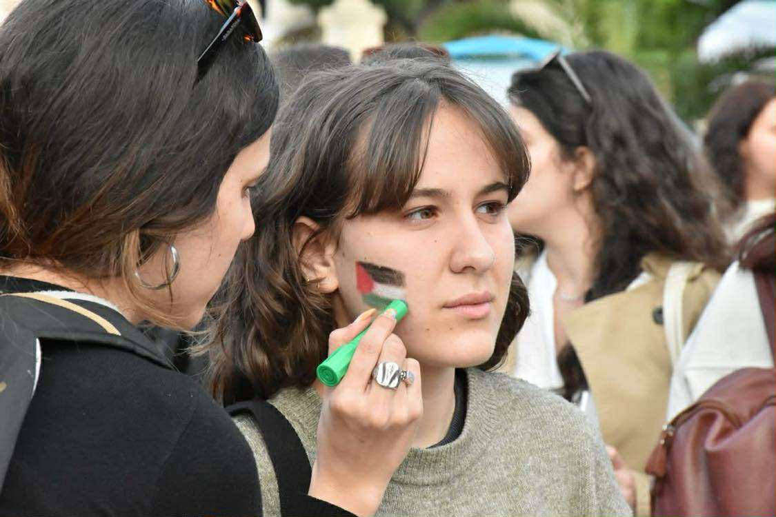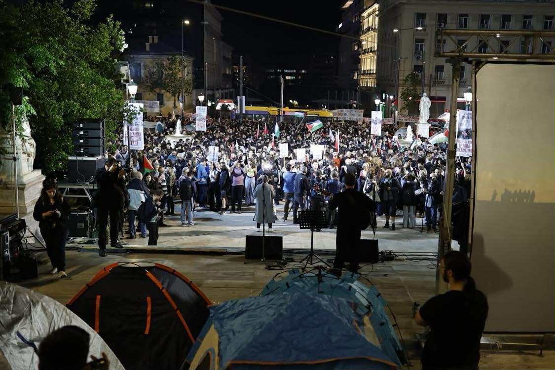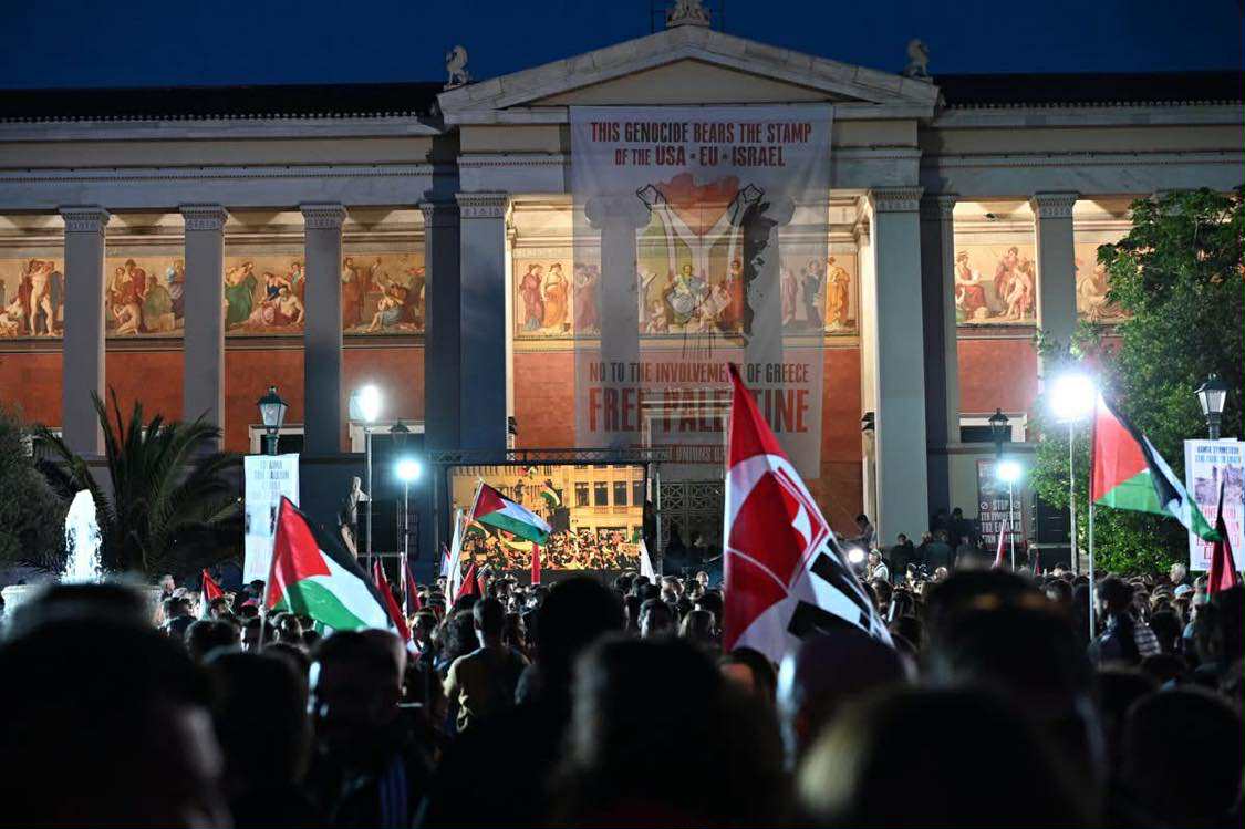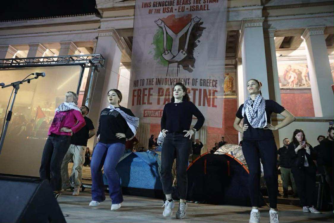 Στην πρώτη γραμμή, μαζί με τους φοιτητές βρέθηκαν εκπρόσωποι της Παλαιστινιακής κοινότητας. Με εικόνες γεμάτες από τη φρίκη στη Γάζα, εικόνες από το πείσμα ενός λαού που έχει πατρίδα, που την πατρίδα του «Παλαιστίνη τη λένε ακόμα», αλλά και εικόνες από τον ξεσηκωμό του λαού και της νεολαίας ενάντια στο συνεχιζόμενο έγκλημα σε όλο τον κόσμο να προβάλλονται στη γιγαντοοθόνη που είχε στηθεί μπροστά στην Πρυτανεία, ένας μετά τον άλλο οι καλλιτέχνες έσμιξαν τη φωνή τους με τους χιλιάδες νέους. Συνεχίζουμε…