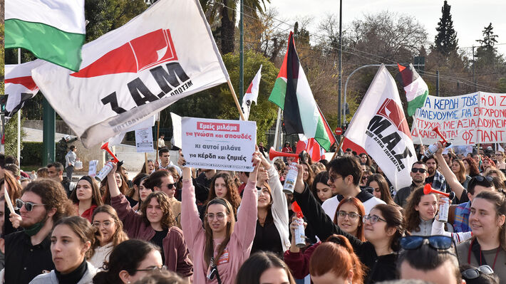 Η κυβέρνηση δεν έχει κανένα δικαίωμα ούτε εξουσιοδότηση να συμμετέχει στον πόλεμο στην Μέση Ανατολή στηρίζοντας το κράτος δολοφόνο του Ισραήλ ούτε στην Ουκρανία! Για αυτό και η πλειοψηφία του λαού και των φοιτητών φωνάζουμε «έξω η Ελλάδα από τον πόλεμο! Λεφτά για την Παιδεία και όχι για τους πολέμους».