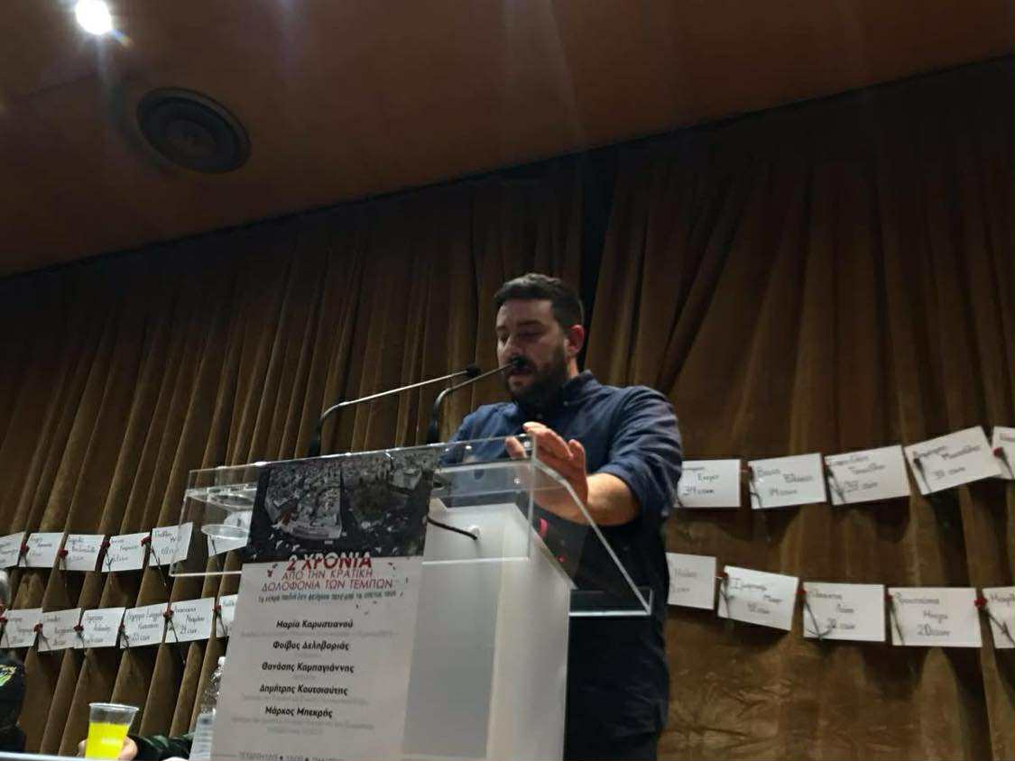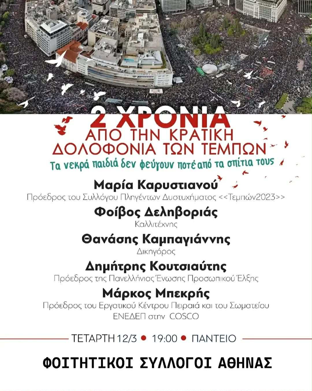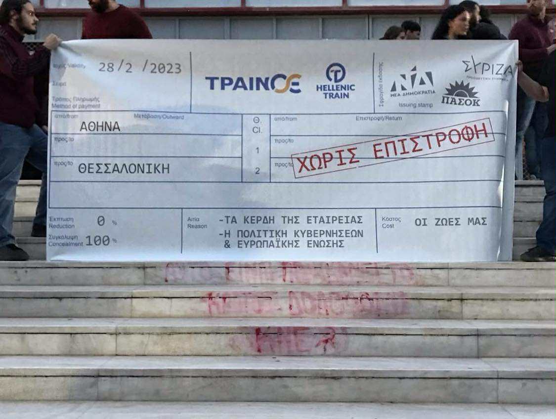 Πιάνοντας το νήμα από τους αγώνες όλου αυτού του διαστήματος, από τη μεγάλη απεργία στις 28 Φλεβάρη, οι Φοιτητικοί Σύλλογοι στο πλαίσιο της εκδήλωσης έδωσαν τον λόγο σε εργαζόμενους και γονείς, και άφησαν το στίγμα του αγώνα για την πραγματική δικαίωση, με τα ονόματα των 57 νεκρών στο φόντο των ομιλητών.
