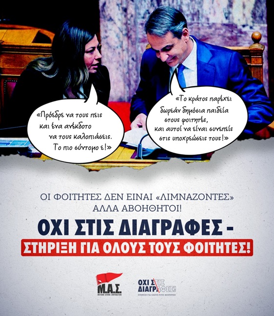 «Περισσότεροι από 120 φοιτητικοί σύλλογοι έχουν ξεκαθαρίσει ότι οι φοιτητές και οι φοιτήτριες της χώρας απαιτούμε στήριξη για τις σπουδές μας και όχι διαγραφές και καταστολή!», τονίζει το Μέτωπο Αγώνα Σπουδαστών (ΜΑΣ) σε ανακοίνωσή του ενάντια στο νομοσχέδιο της κυβέρνησης για τις διαγραφές φοιτητών από πανεπιστήμια και την καταστολή.