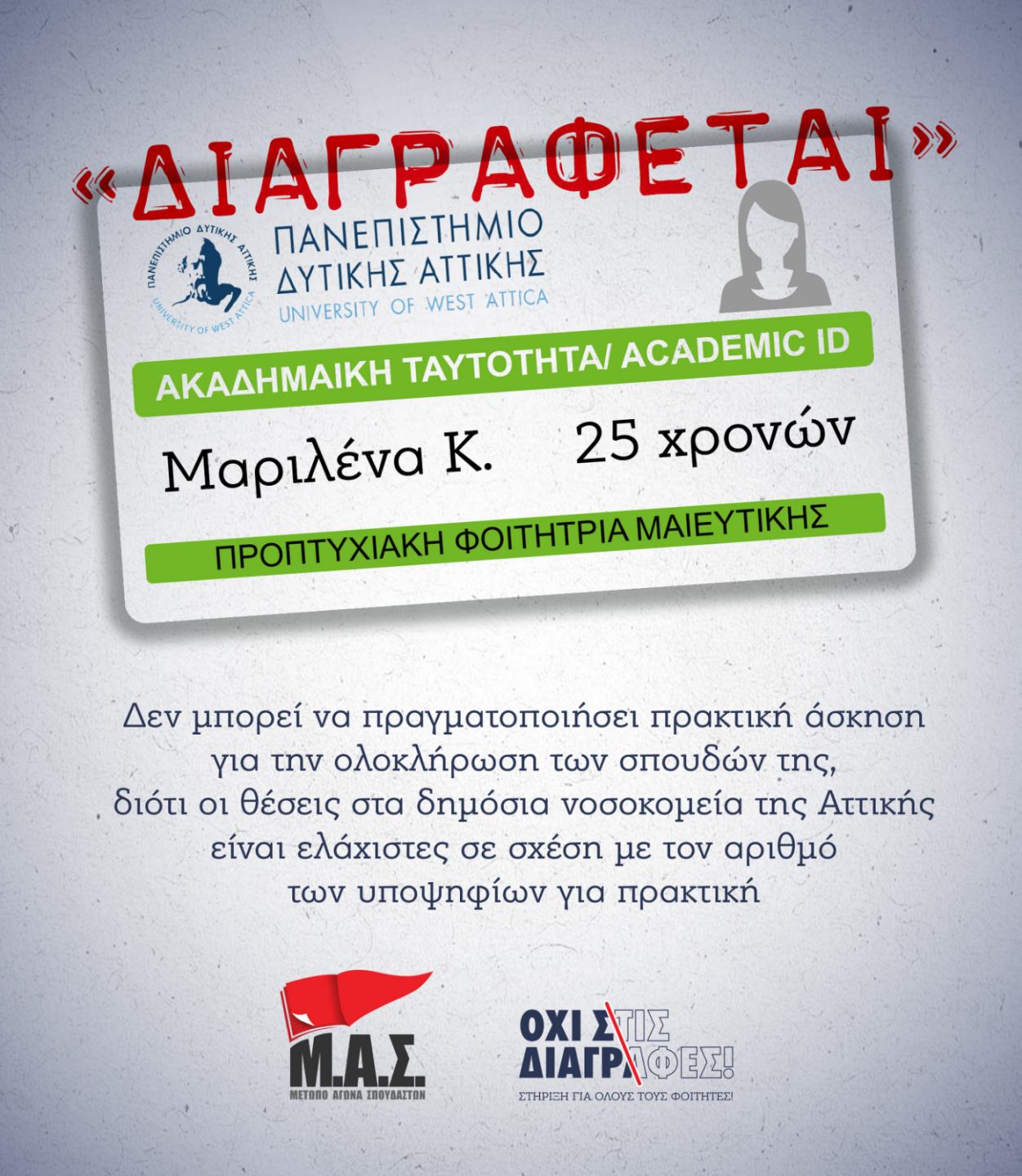 Δεν μπορεί να πραγματοποιήσει πρακτική άσκηση για την ολοκλήρωση των σπουδών της, διότι οι θέσεις στα δημόσια νοσοκομεία της Αττικής είναι ελάχιστες σε σχέση με τον αριθμό των υποψηφίων για πρακτική