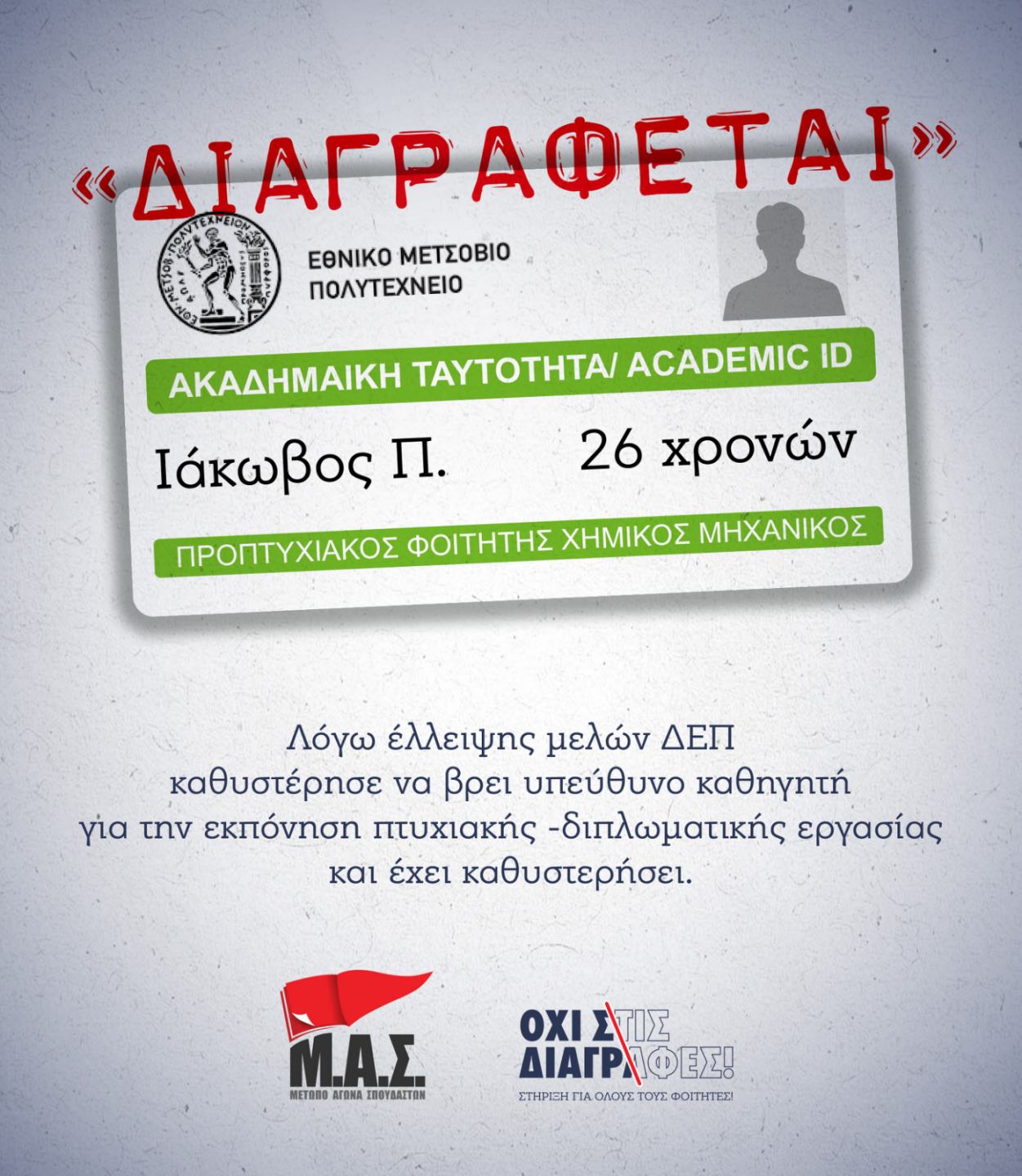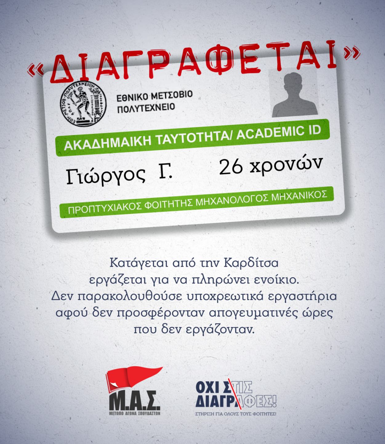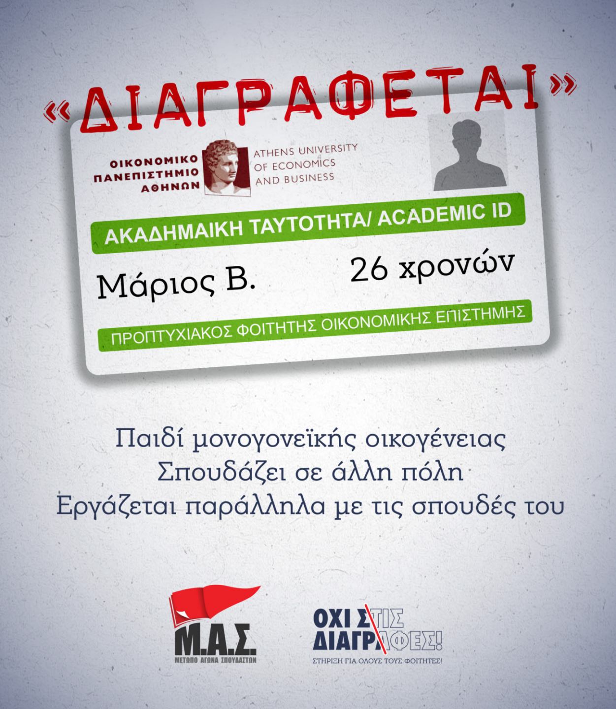 Ας δούμε ορισμένα παραδείγματα φοιτητών που η κυβέρνηση διαγράφει αφού και όσα ανακοινώνει ως «προβλέψεις» δεν αρκούν, αντίθετα αποκλείουν χιλιάδες ενεργούς φοιτητές ενώ από την άλλη δεν αντιμετωπίζουν στο ελάχιστο τις αιτίες που οδηγούν στην καθυστέρηση ολοκλήρωσης των σπουδών τους. Μόνη λύση είναι να παρθούν μέτρα στήριξης των φοιτητών και όχι διαγραφές.