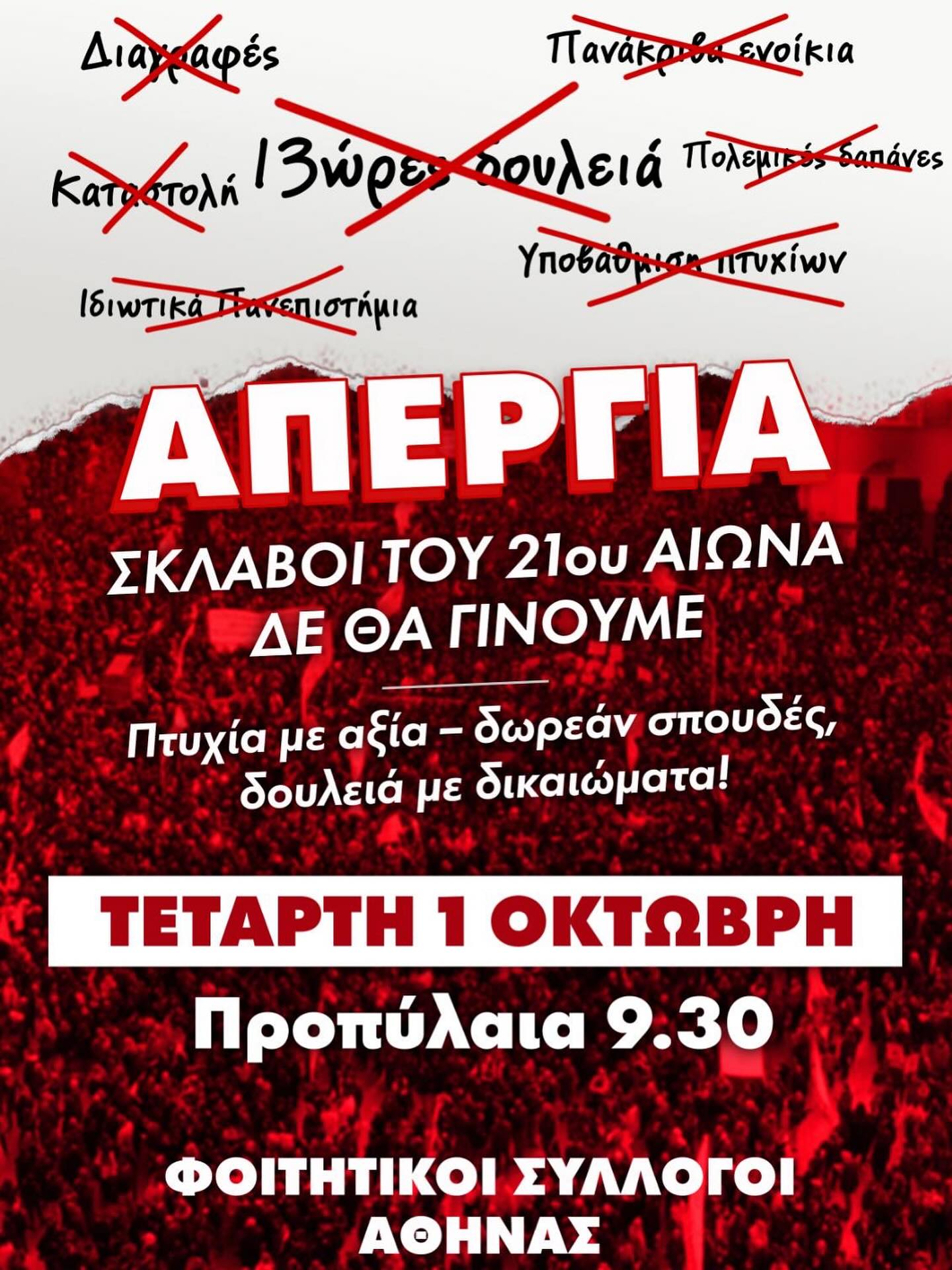 Όλοι και όλες στην πανελλαδική απεργία την Τετάρτη 1 Οκτώβρη στα Προπύλαια 10:00 πμ (Στάση μετρό Πανεπιστήμιο) γιατί δεν δεχόμαστε να γίνουμε σκλάβοι τον 21ο αιώνα με το άθλιο νομοσχέδιο της κυβέρνησης και της ΕΕ για την 13ωρη δουλειά, που διαλύει την εργασιακή μας προοπτική και τη ζωή μας.